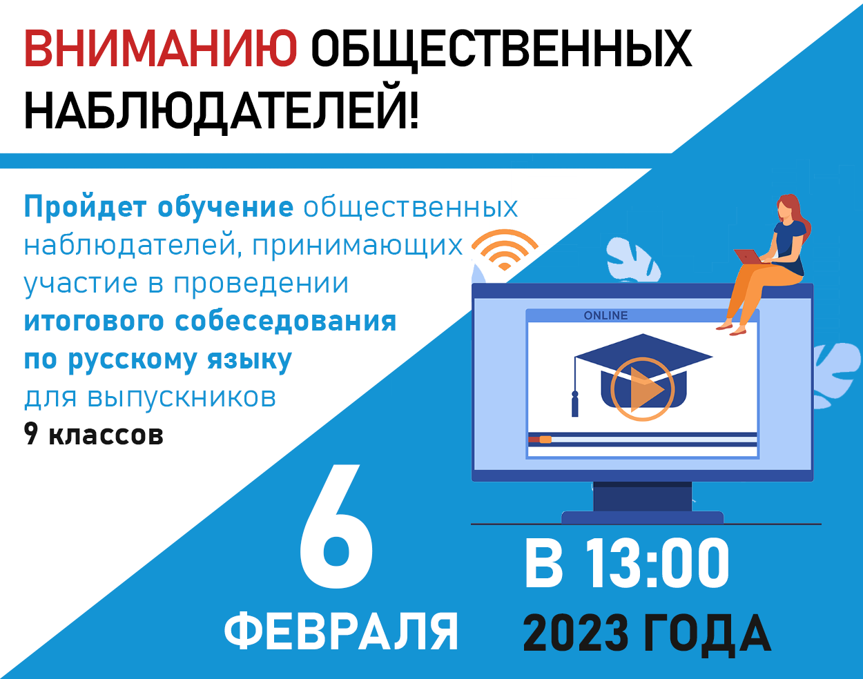 6 февраля 2023 года в 13.00 часов пройдет обучение общественных наблюдателей, принимающих участие в проведении итогового собеседования по русскому языку для выпускников 9 классов 8 февраля.