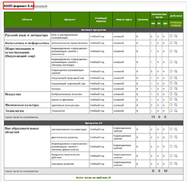 Если вариант АООП предполагает, что обучающийся получает образование, которое по содержанию и итоговым достижениям не соотносится к моменту завершения школьного обучения с содержанием и итоговыми достижениями сверстников, перечень учебных предметов АООП полностью не соответствует перечню учебных предметов ООП, то создается полностью новый шаблон учебного плана, с указанием варианта АООП и назначается на класс.
