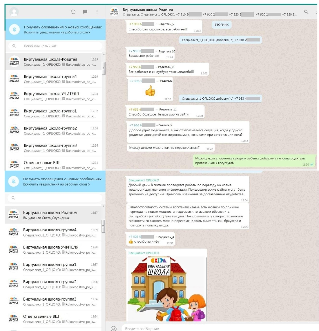 При возникновении вопросов по работе с информационной системой образовательных услуг «Виртуальная школа», связанных с обновлением её функциональных возможностей, в помощь пользователям — родителям специалистами ОРЦОКО создана группа в мессенджере WhatsApp Виртуальная школа-Родители. Вопросы, которые интересуют родителей, разные, начиная от того как войти в систему до прикрепления домашнего задания в электронном дневнике. Следует отметить, что группа не является закрытой и состав участников день ото дня увеличивается.