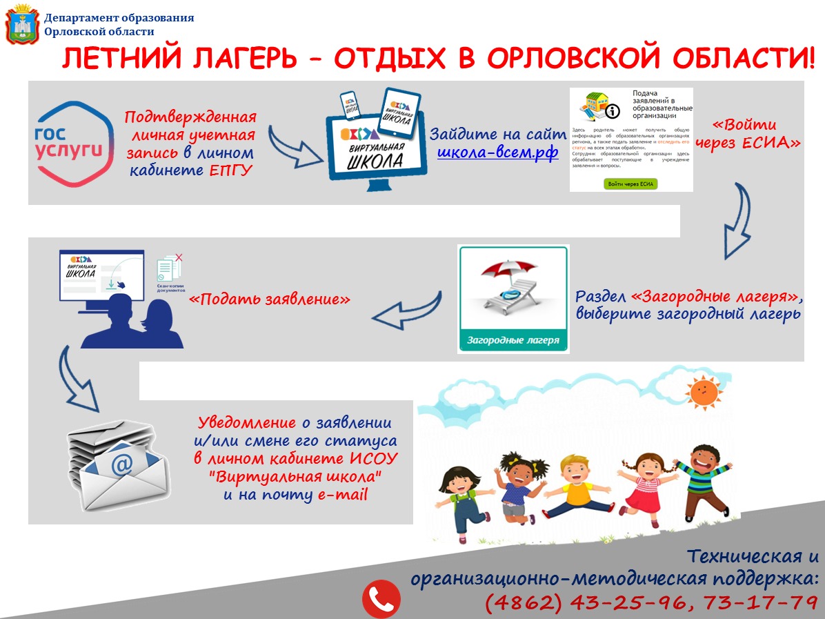 На портале муниципальных услуг ИСОУ «Виртуальная школа» работает сервис подачи заявлений в загородные оздоровительные лагеря Орловской области в разделе «Загородные лагеря».