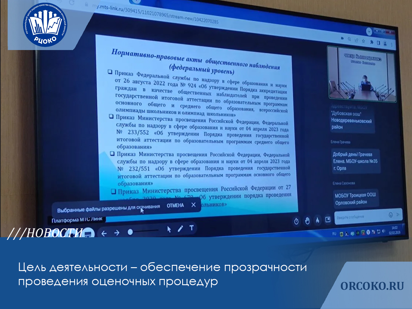 2 февраля 2026 года казенным учреждением Орловской области «Региональный цент оценки качества образования» (РЦОКО) был проведён обучающий вебинар для будущих общественных наблюдателей, которые в 2026 году будут участвовать в оценочных процедурах на территории Орловской области.