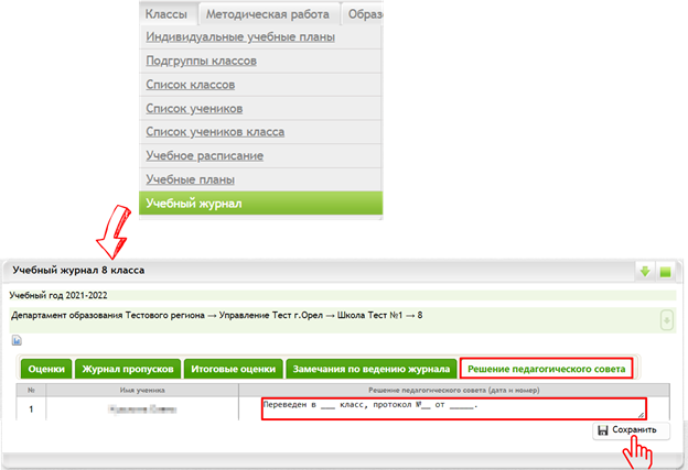 В электронном журнале перевод обучающихся на новый учебный год оформляется в виджете «Классы» на вкладке «Учебный журнал» в разделе «Решение педагогического совета».