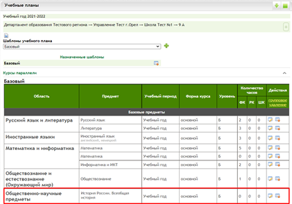 в правом нижнем углу страницы) в учебный план курс «История России. Всеобщая история» с количеством часов 0 (ноль).