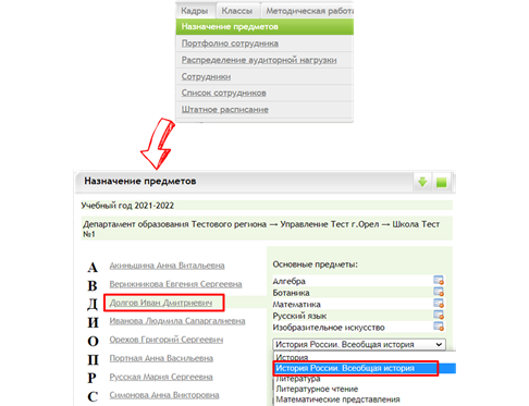 - В виджете «Кадры» на вкладках «Назначение предметов» и «Распределение аудиторной нагрузки» назначить и распределить нагрузку учителю-предметнику.