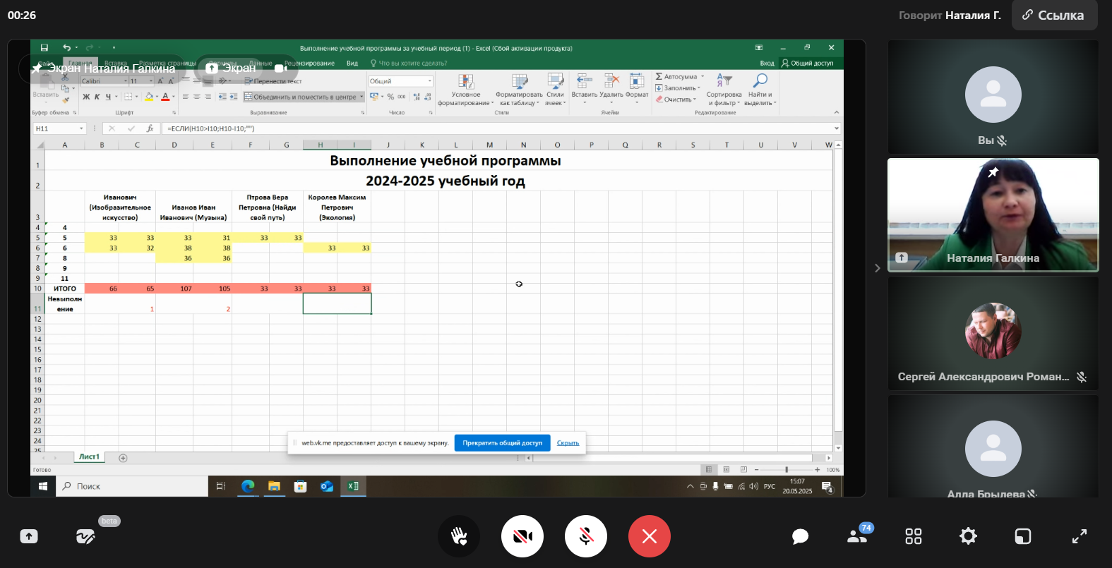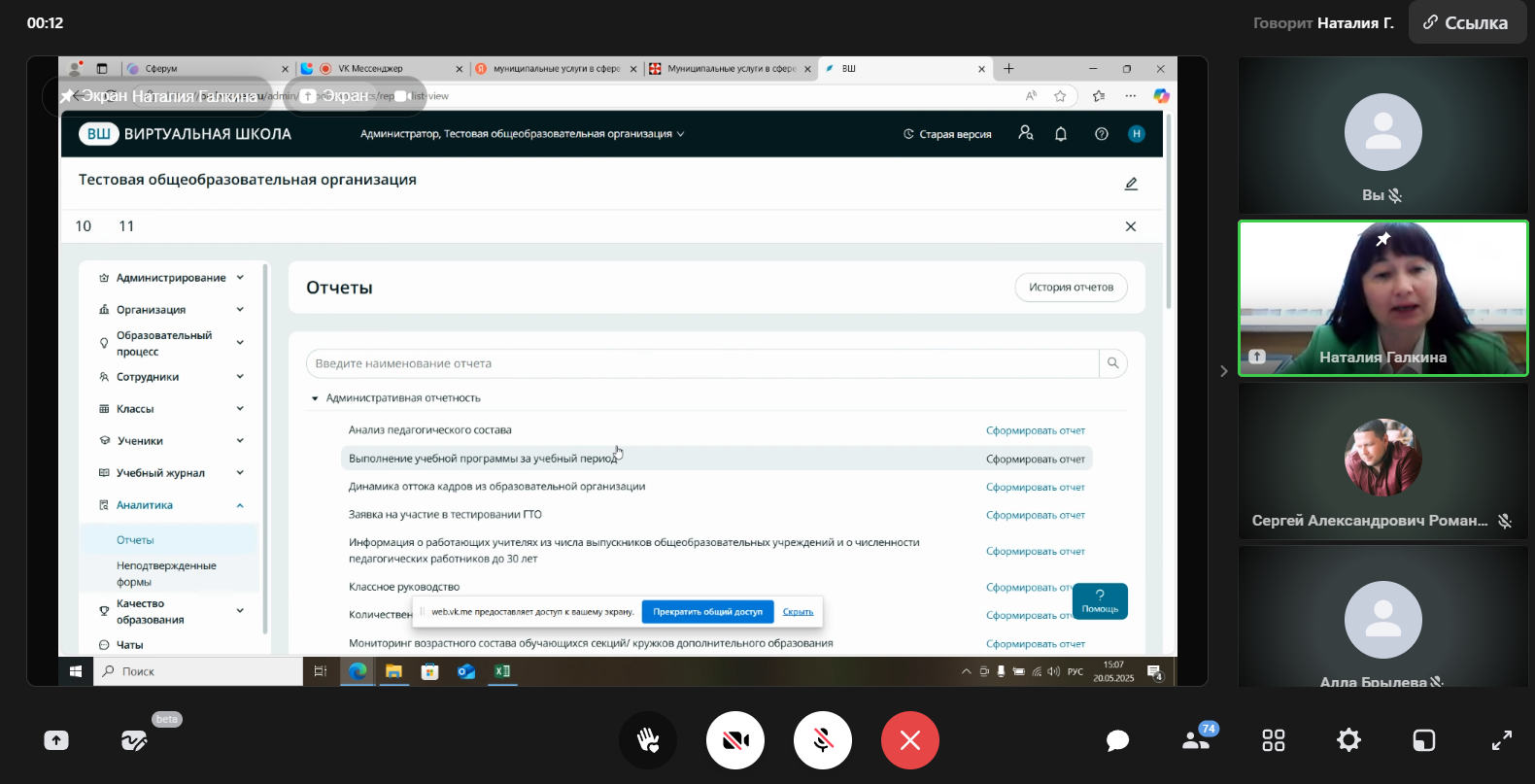 Подводя итог учебного процесса, участники ВКС обсудили следующие вопросы: выставление годовых отметок за учебный год, проверка выполнение учебной программы, допуск обучающихся к ГИА, оформление выбытия учеников в электронном журнале, оформление переводов в летний период.