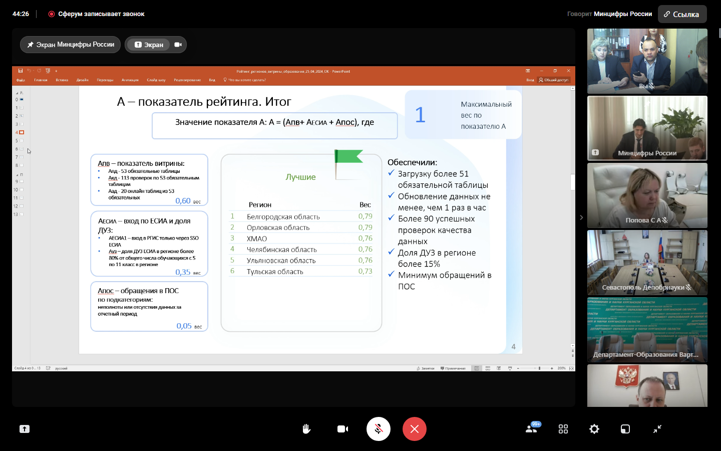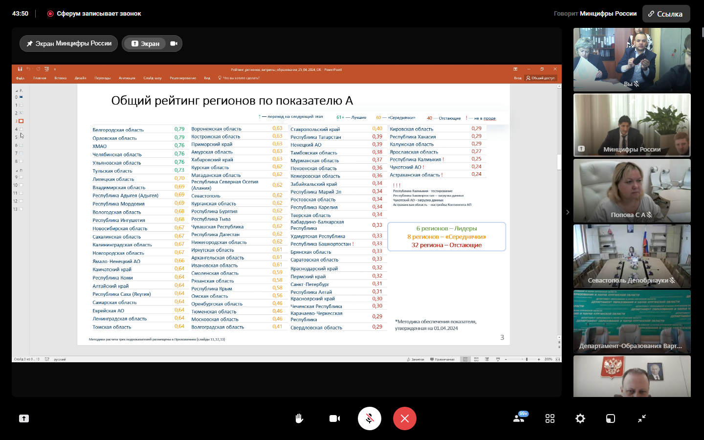 25 апреля 2024 года в формате видеоконференцсвязи прошло совещание ответственных сотрудников органов государственного управления системой образования, организованное Министерством цифрового развития, связи и массовых коммуникаций Российской Федерации.