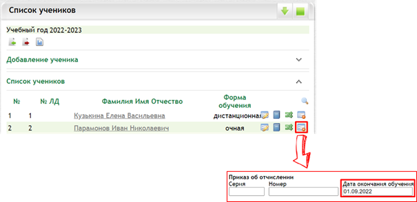 Если общеобразовательная организация осуществила переход на новый учебный год в ИСОУ «Виртуальная школа», но при этом не актуализировала списки учеников, необходимо при отчислении детей оформлять листок выбытия, указав дату окончания обучения – 1 сентября 2022 года. В противном случае система не позволит провести отчисление.